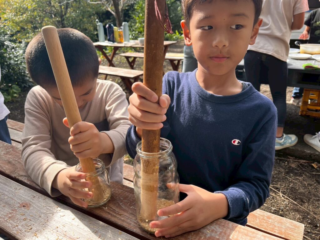 すり鉢にボールでコロコロして籾摺りをして出来た玄米を、瓶に入れてすりこぎ棒でコンコン叩いて精米していきました。