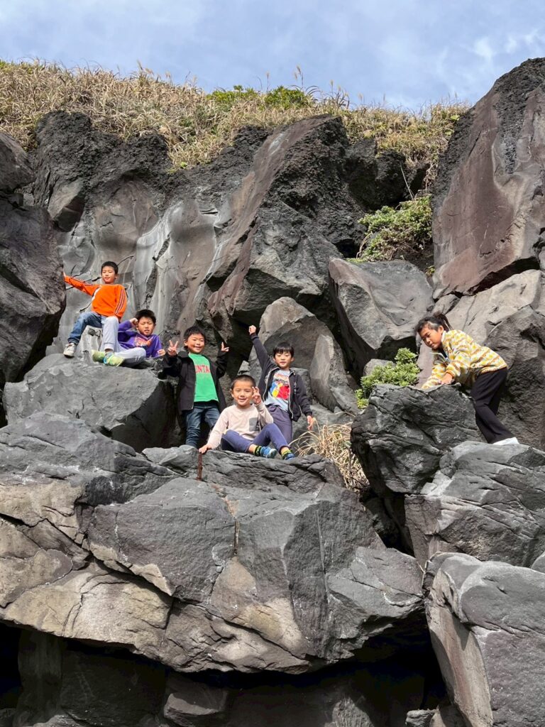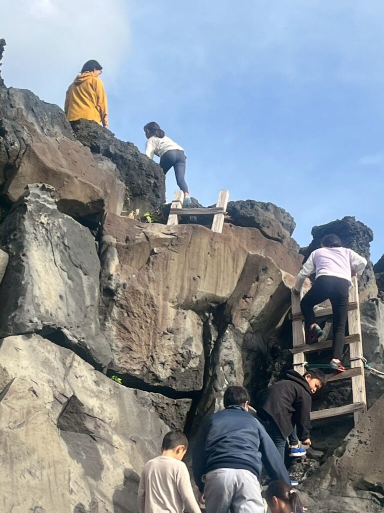 岩場をハシゴを使って登っていきます。高さがありましたが、子どもたちは身軽にぴょんぴょん登っていきました。