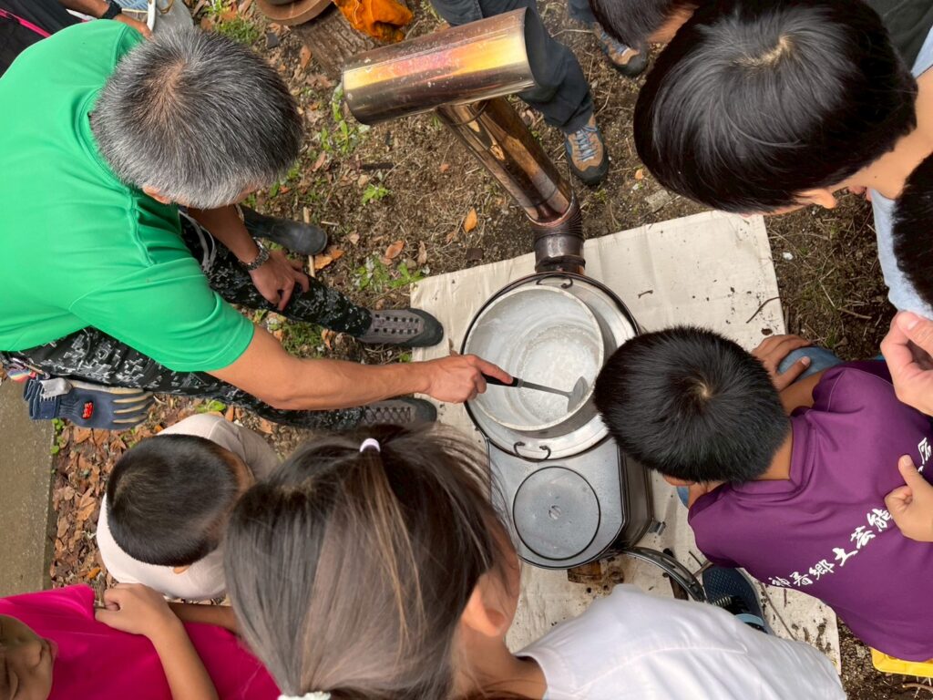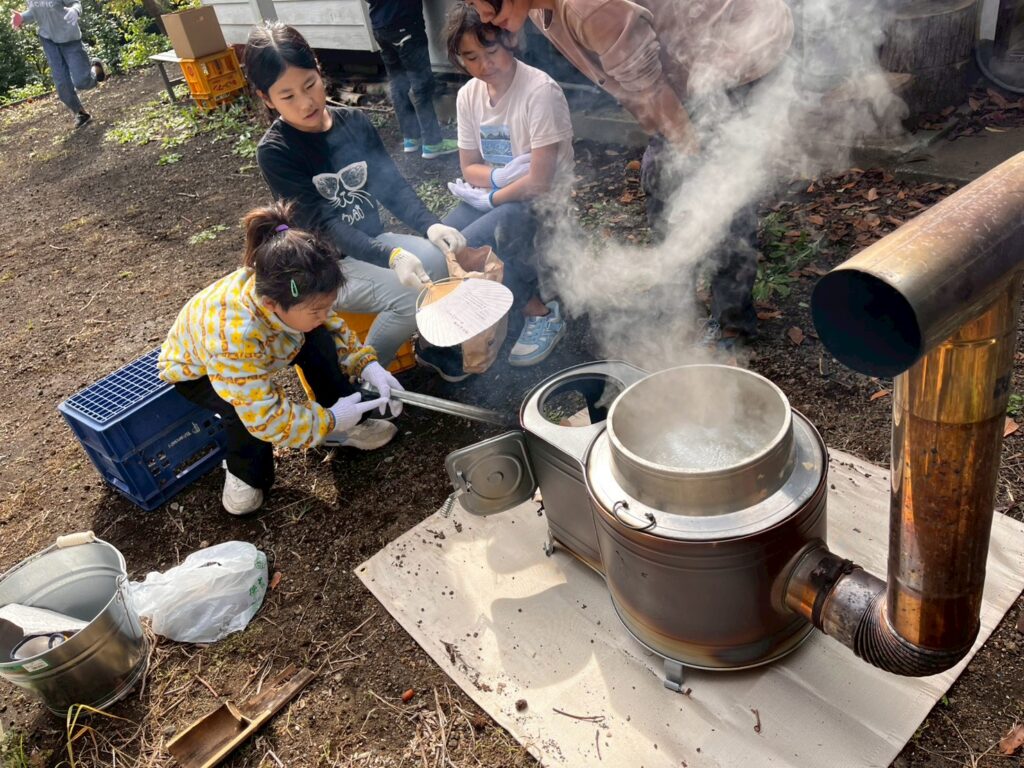 1つ目は海水を沸かすために、時計ストーブに火をつけて薪や竹をどんどん入れました🔥