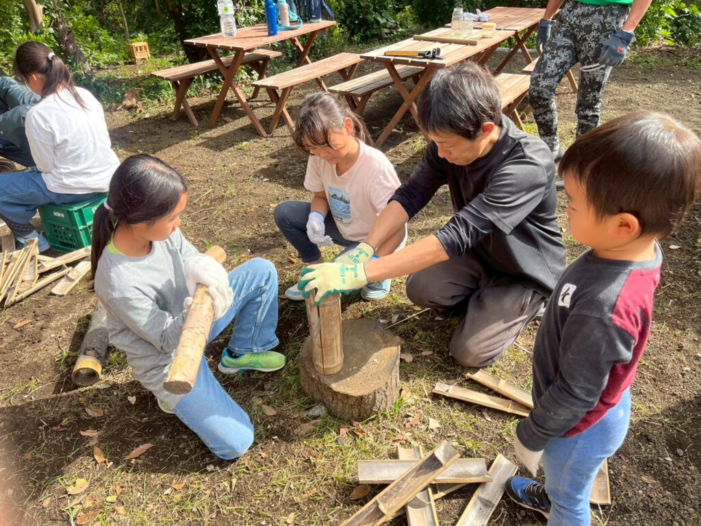 ノコギリで枝を切り、鉈で竹を割っていきました🪚🪵