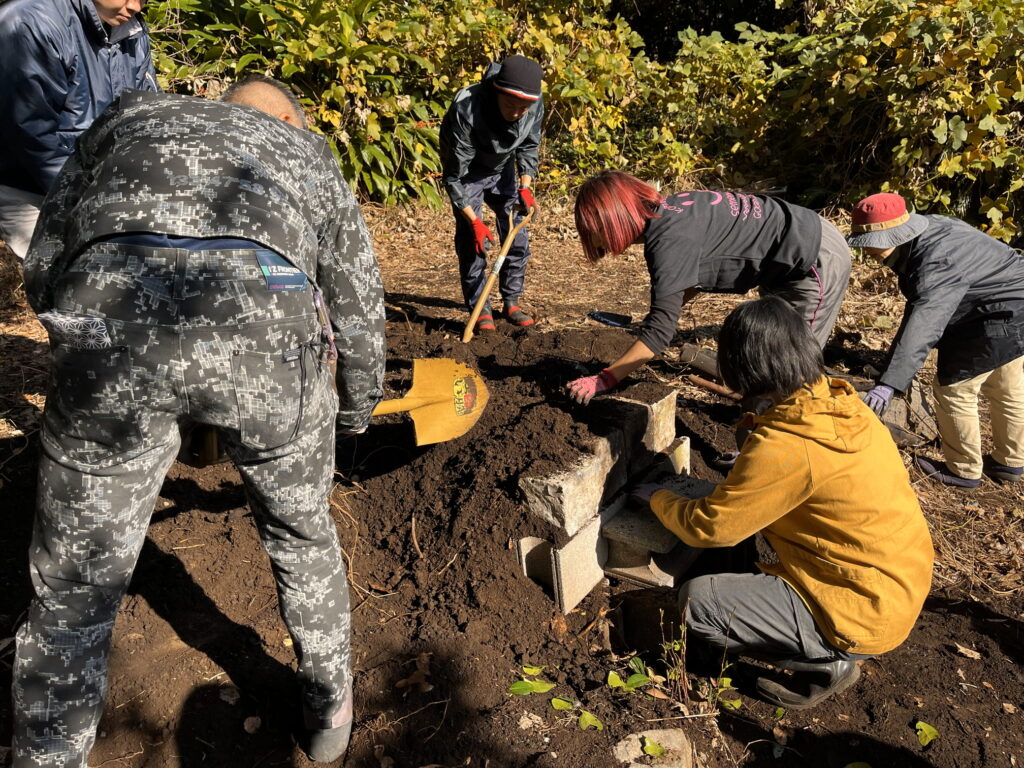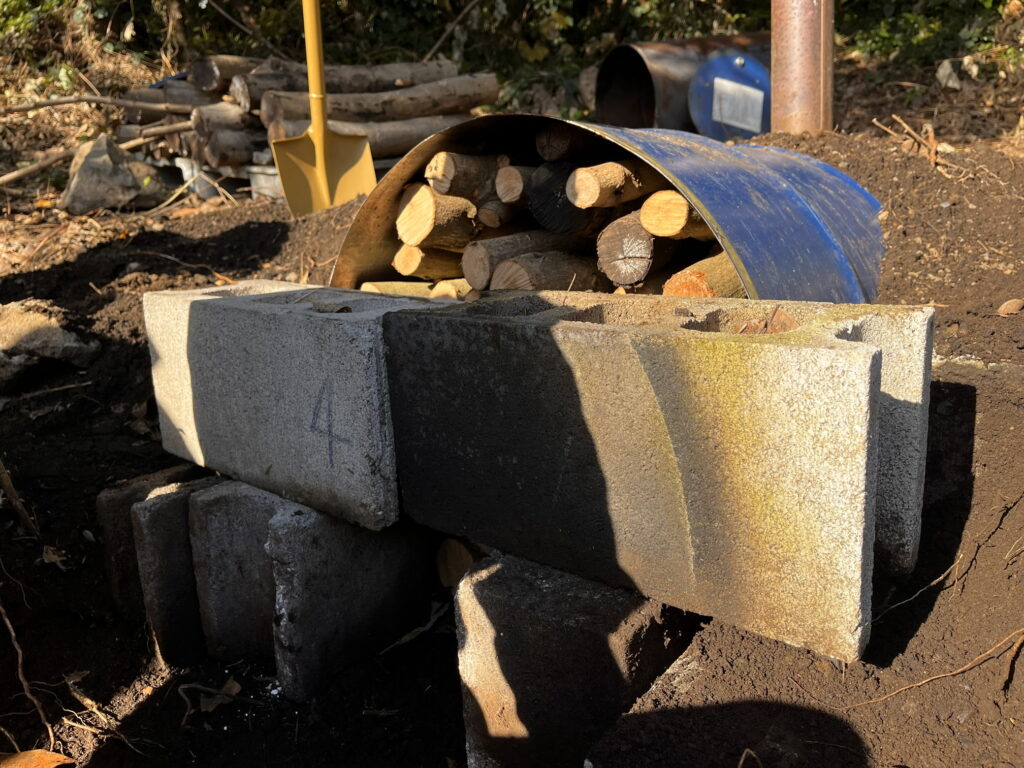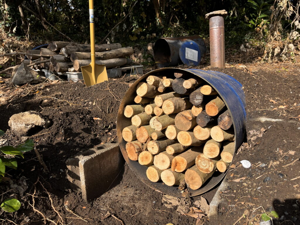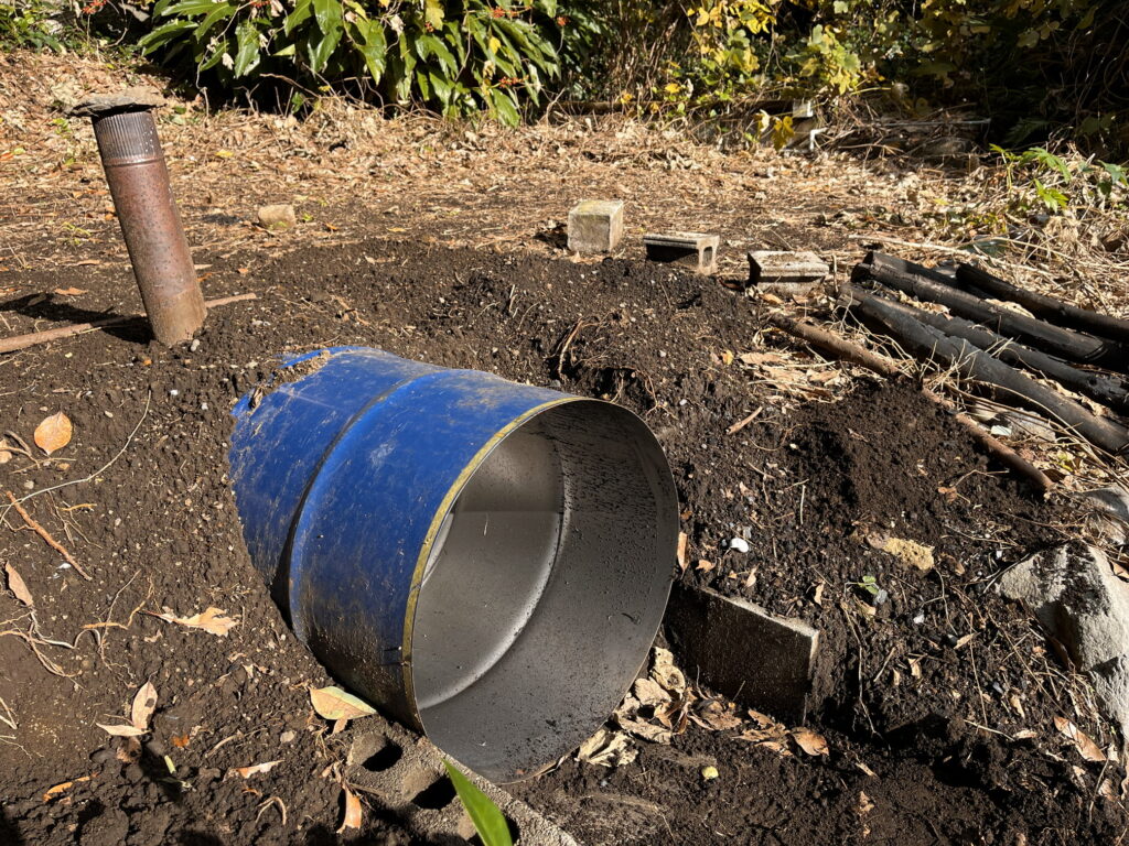 ドラム缶に木を詰めたら、ブロックで蓋をして、空気が入り込まないよう隙間をきっちり土で埋めます。