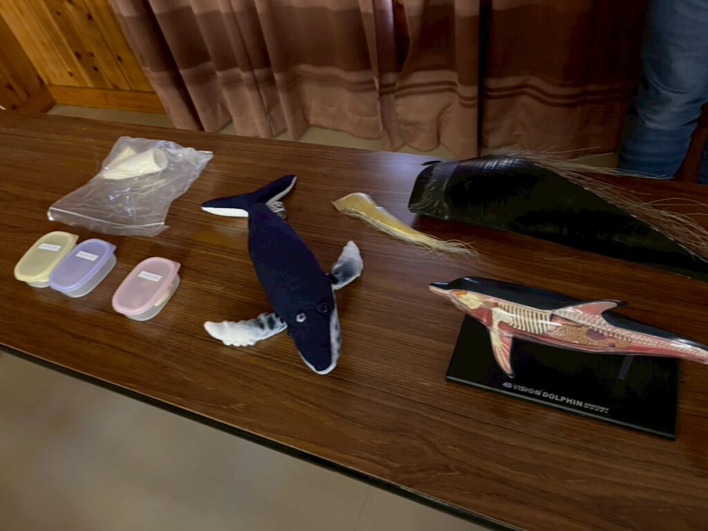 クジラの模型やウミカメの人形などを使って、子どもたちにも視覚的・感覚的に伝わりやすい方法も教えてもらいました。
